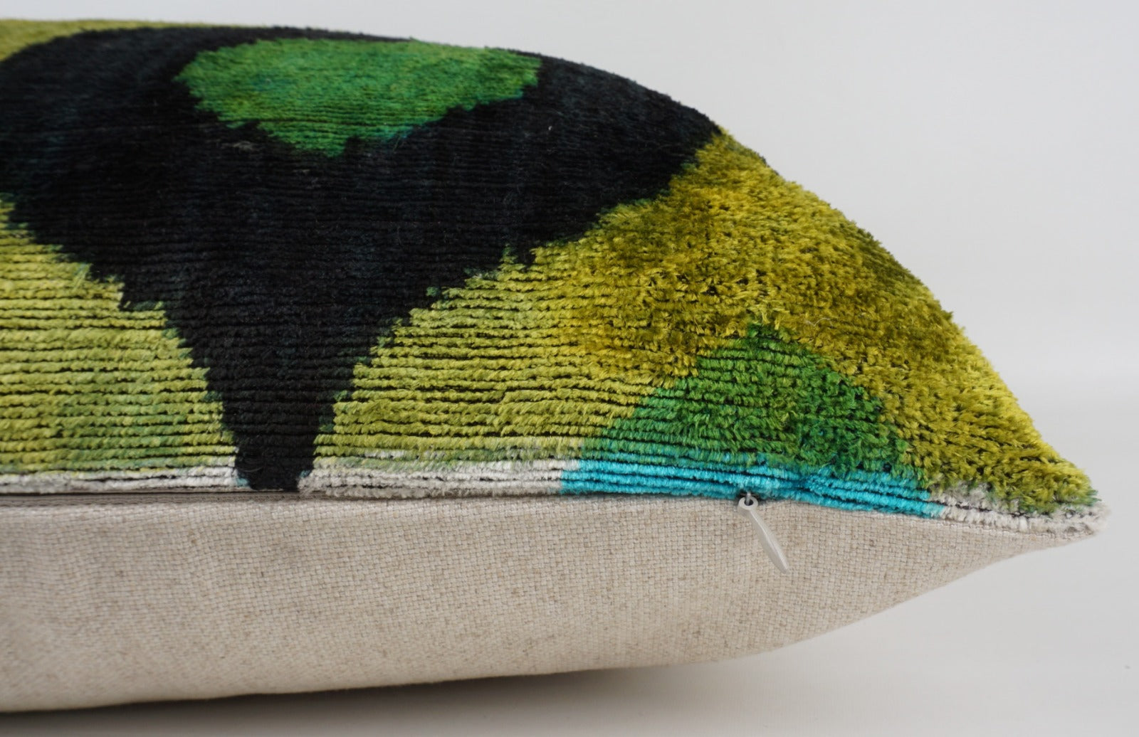 Ein markantes Statement mit Tiefe: Das handgewebte Seidenkissen zeigt ein grafisches Ikat-Muster aus weichen Ovalen in Grün, Schwarz und Safran. Der schimmernde Silk/Velvet betont Struktur und Farbspiel – gefertigt in Europa, ein Stück ruhiger Luxus für dein Zuhause.